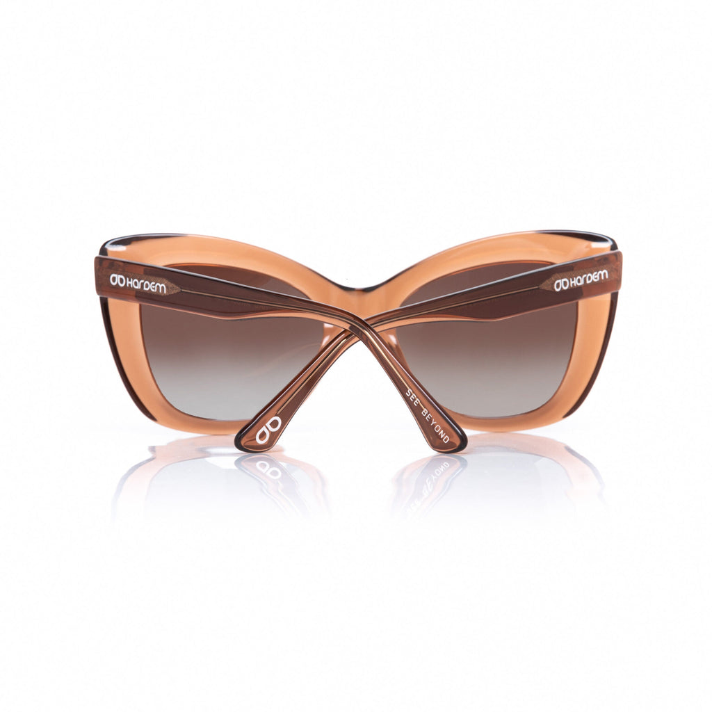 Sunglasses made of eco-friendly acetate with translucent glossy caramel front and temples. Gradient sepia lenses with UV 400 protection and polarized.