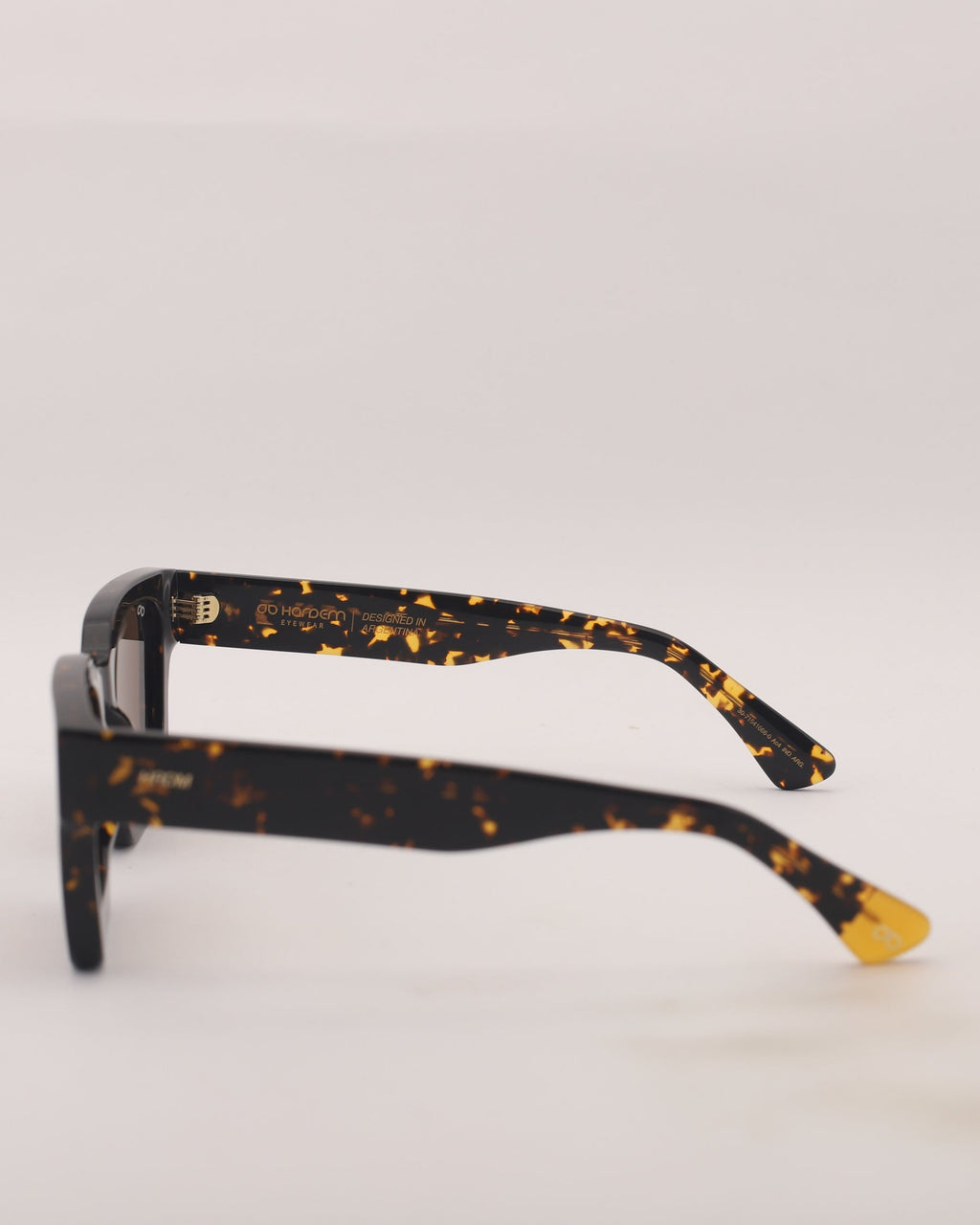 Eyeglass frame made of eco-friendly acetate with shiny tortoiseshell front and temples.