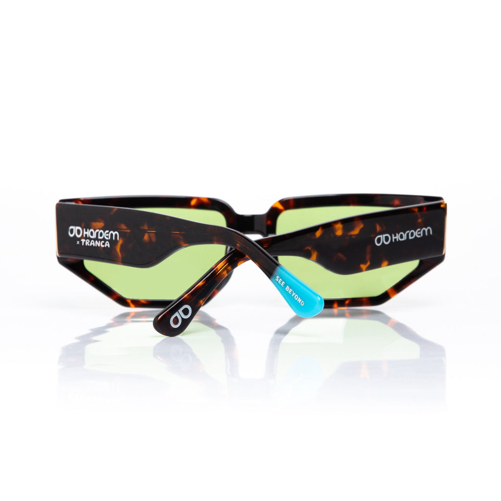 Sunglasses made of eco-friendly acetate with shiny tortoiseshell front and temples. Gold design details on the temples. Bottle green lenses with UV 400 protection and polarized.