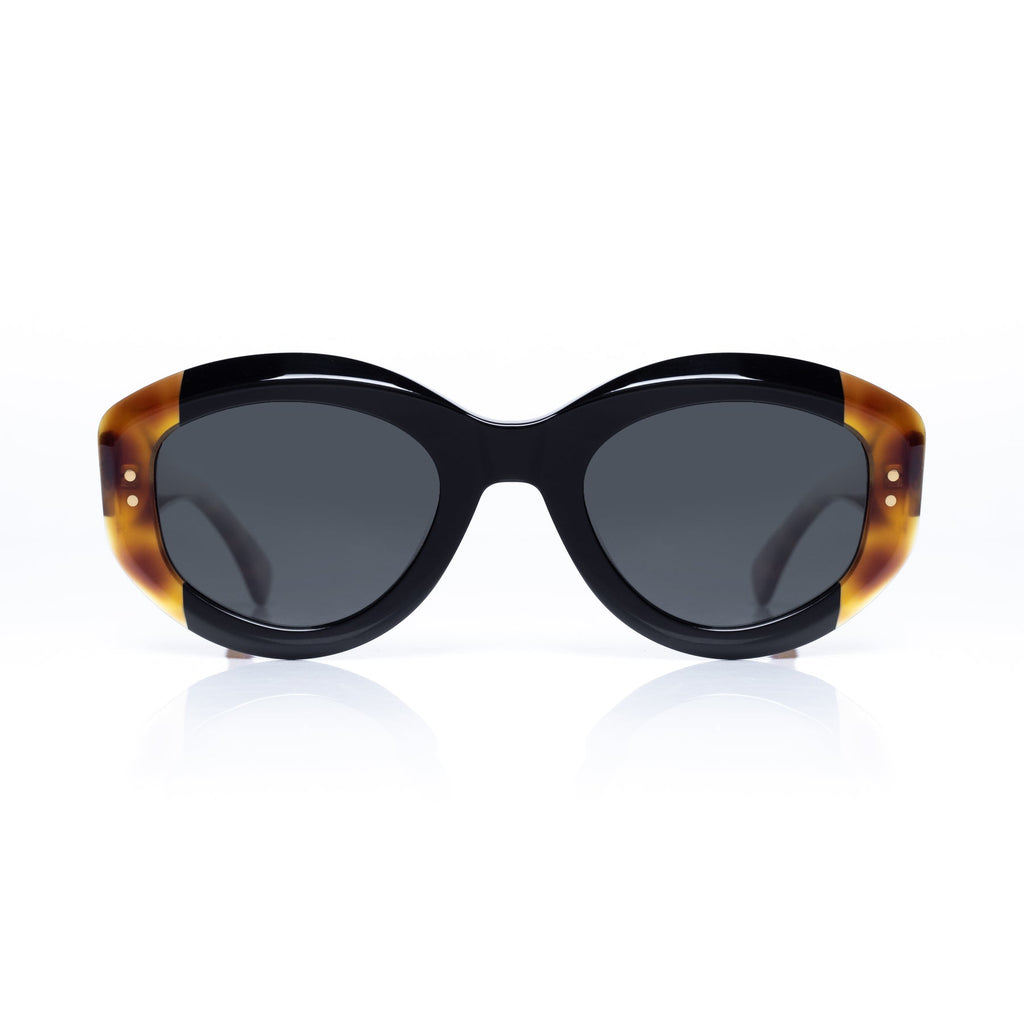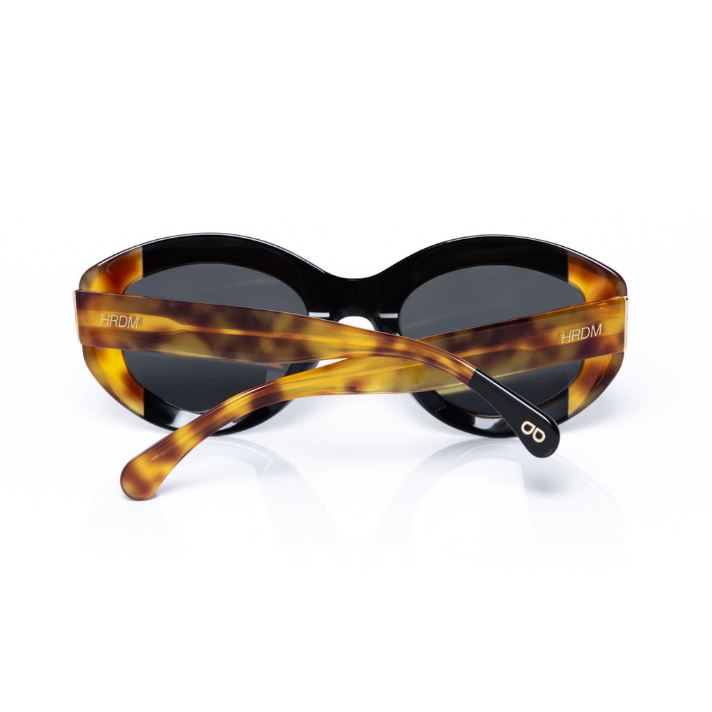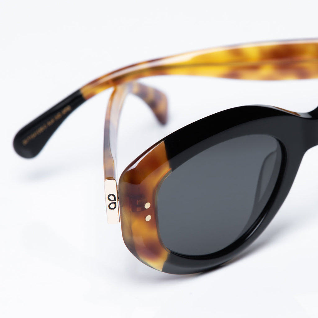 Sunglasses made of eco-friendly acetate with black front and tortoiseshell temples. Silver design details on the temples. Gradient sepia lenses with UV 400 protection and polarized.