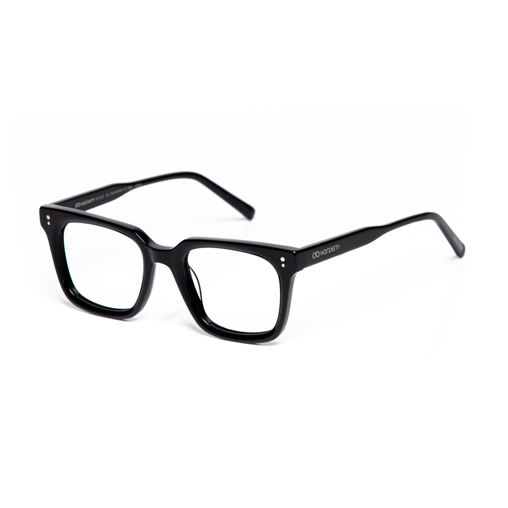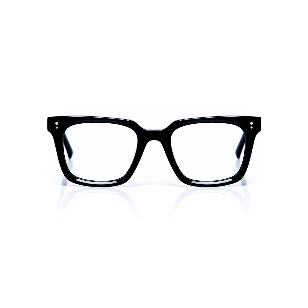 Eyeglass frame made of eco-friendly acetate with glossy black front and temples.