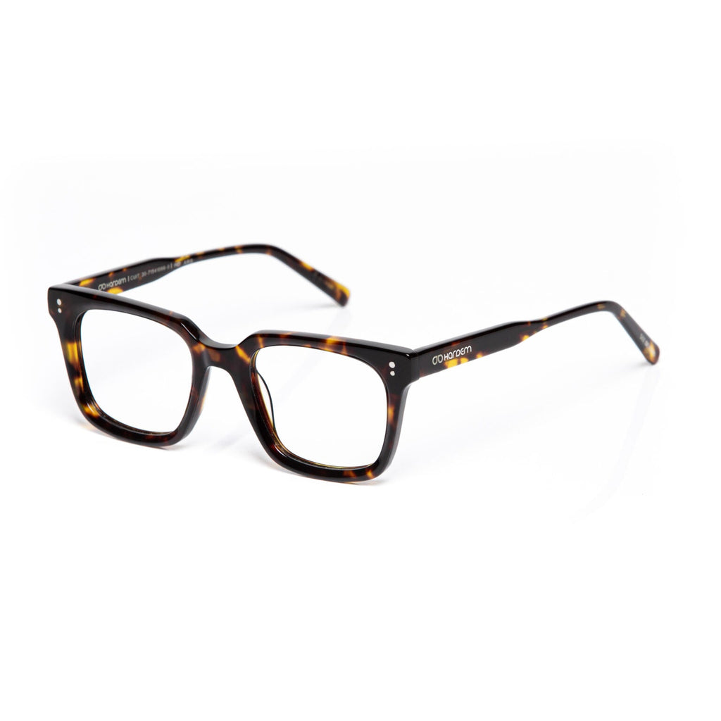 Eyeglass frame made of eco-friendly acetate with shiny tortoiseshell front and temples.