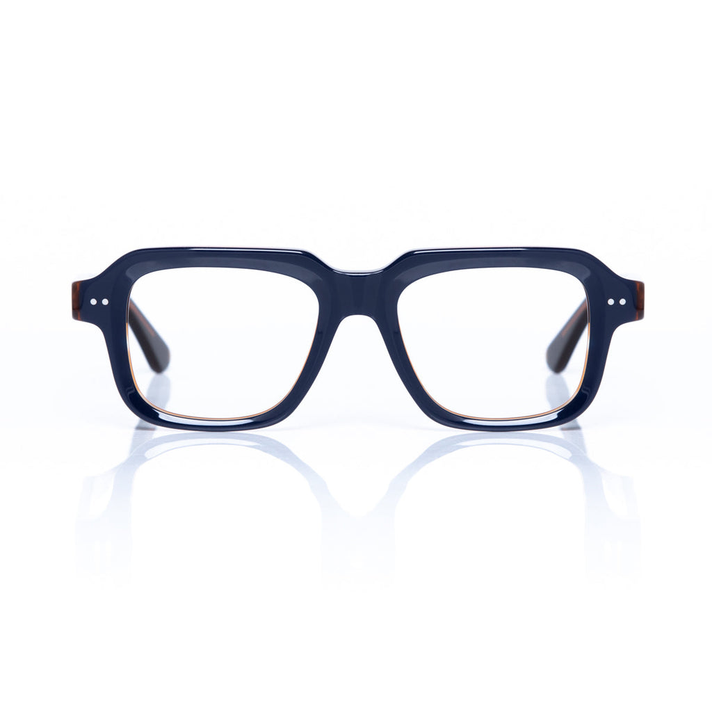 Bicolor eco-friendly acetate eyeglass frame with a blue front and glossy translucent interior, featuring fixed blue hinges and a translucent brown interior.