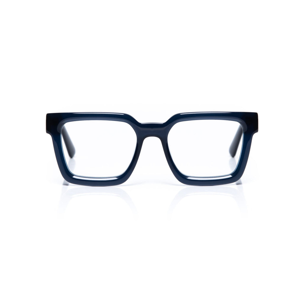 Eyeglass frame made of eco-friendly acetate with glossy blue front and temples.